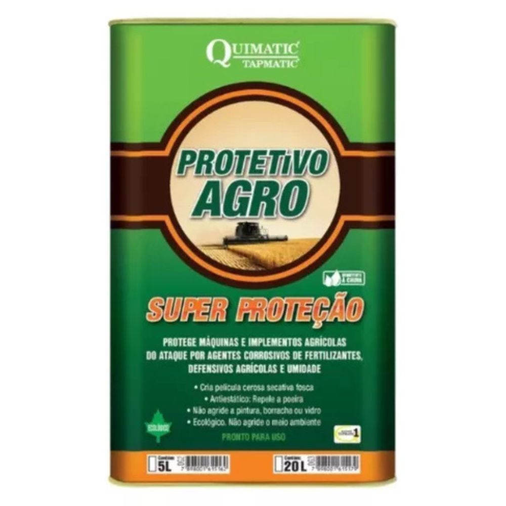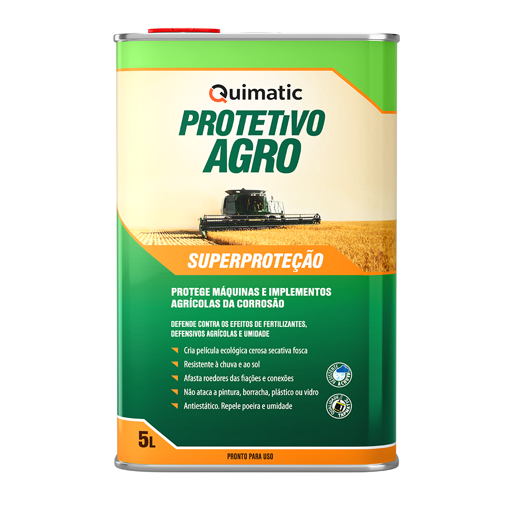 QUIMATIC PROTETIVO AGRO SUPERPROTEÇÃO é um protetivo de película cerosa fosca, seca, antiestática, de penetração rápida, que confere excelentes propriedades de proteção anticorrosiva mesmo com o equipamento exposto ao sol e a chuva, em conformidade com o Protetivo Tipo A da Norma API 686.